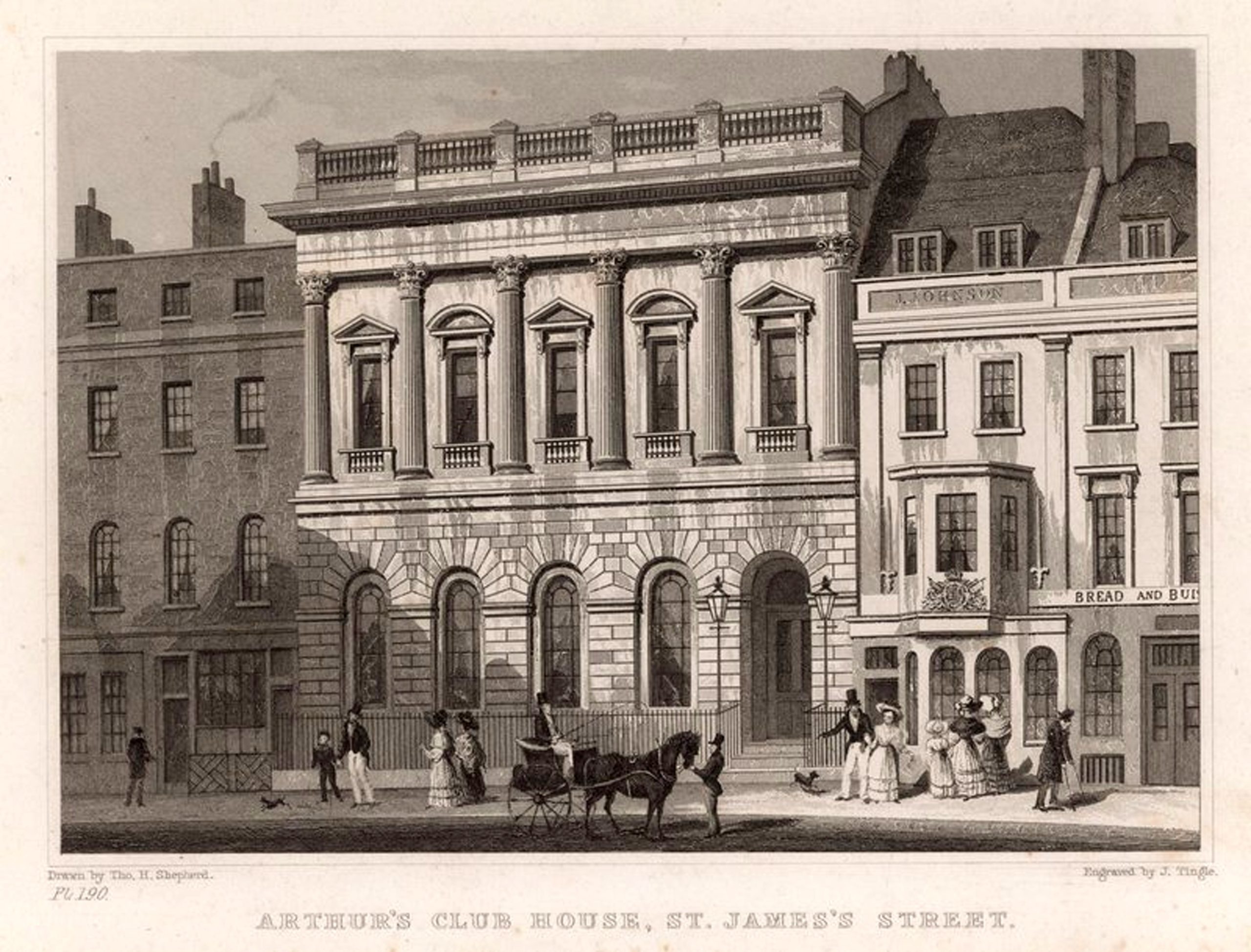 在托马斯·霍斯默·谢泼德(Thomas Hosmer Sheperd)的一幅版画作品中,再现了“波拿巴亲王”旅居伦敦期间的圣詹姆斯街亚瑟俱乐部的风貌。