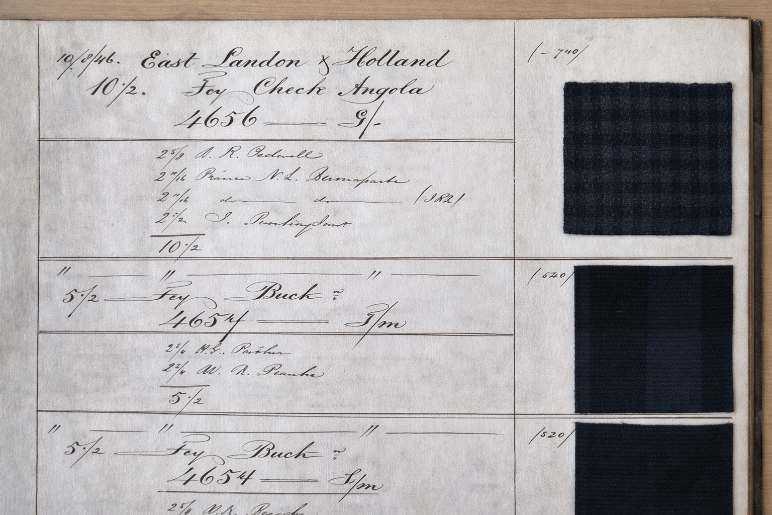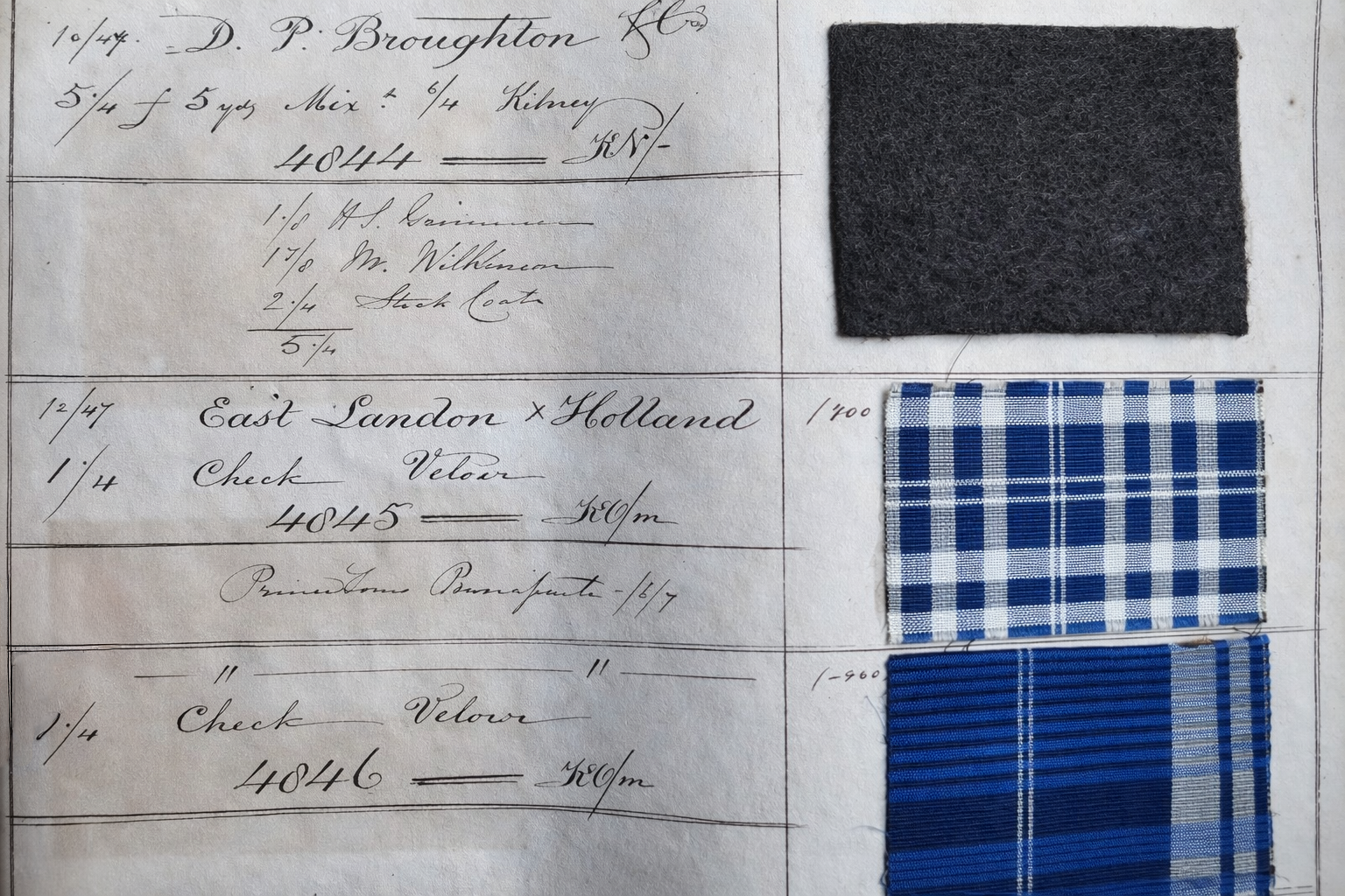 维达莱历史档案馆珍藏的珍贵样本册中,查尔斯-路易·拿破仑·波拿巴订购的两块面料样品。